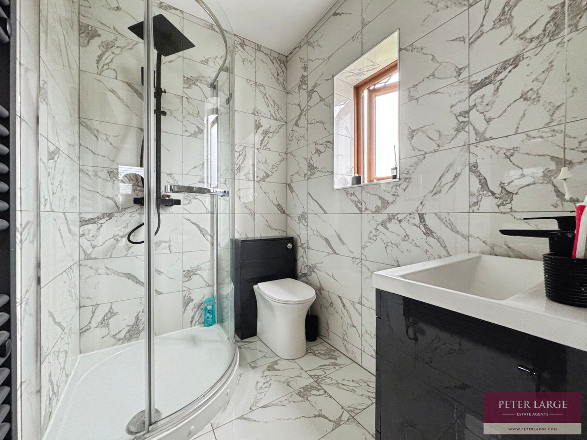 EN-SUITE: 6' 5" x 5' 1" (1.98m x 1.56m) Having a corner shower cubicle with power shower over, low flush W.C, wash hand basin in vanity unit, towel rail incorporating radiator, tiled walls, tiled floor and uPVC double glazed frosted window.