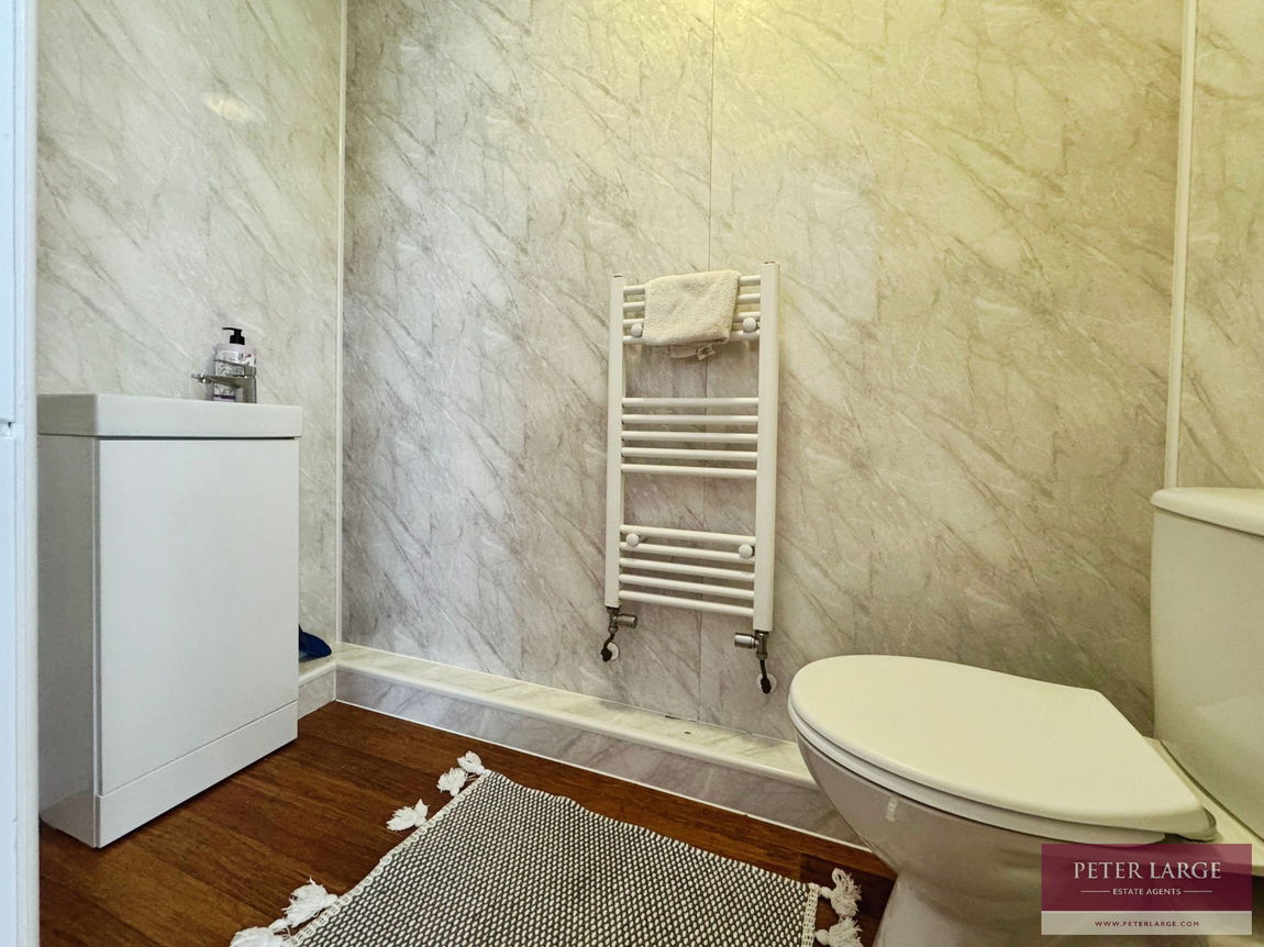 CLOAK ROOM OFF: 6' 10" x 3' 2" (2.09m x 0.99m) Having the continuation of the woodblock floor with low flush W.C, wash hand basin in vanity unit, towel rail incorporating radiator and panelled PVC walls.