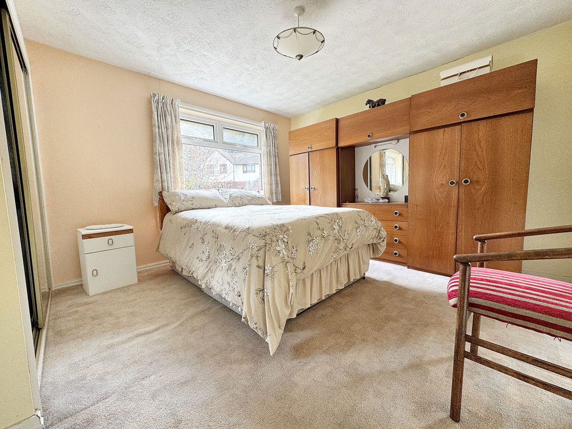 Window to rear, radiator and power points. Range of fitted wardrobes and door to;