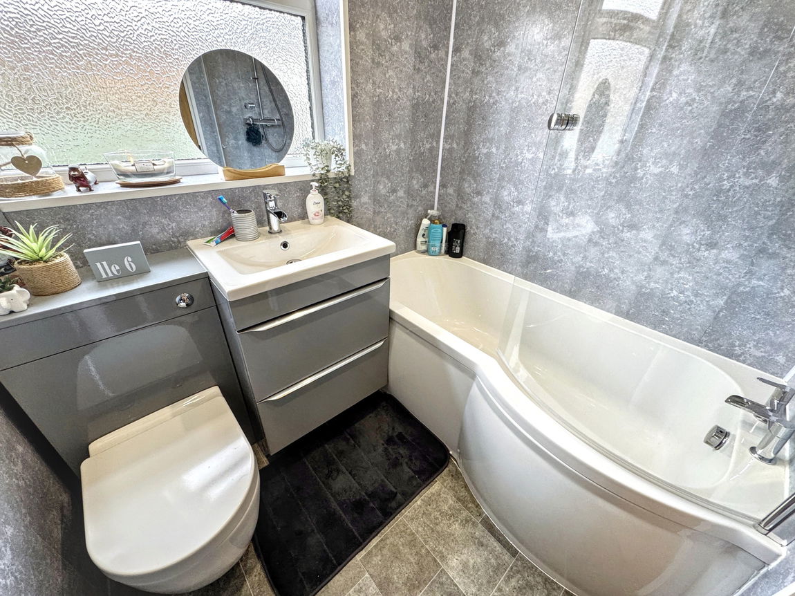 Fitted with a modern white suite comprising wc and wash hand basin within cabinets plus a 'P' shaped bath with shower and screen. Ceiling spotlights, extractor fan, panel walls, chrome 'ladder style' radiator and obscure glazed window.