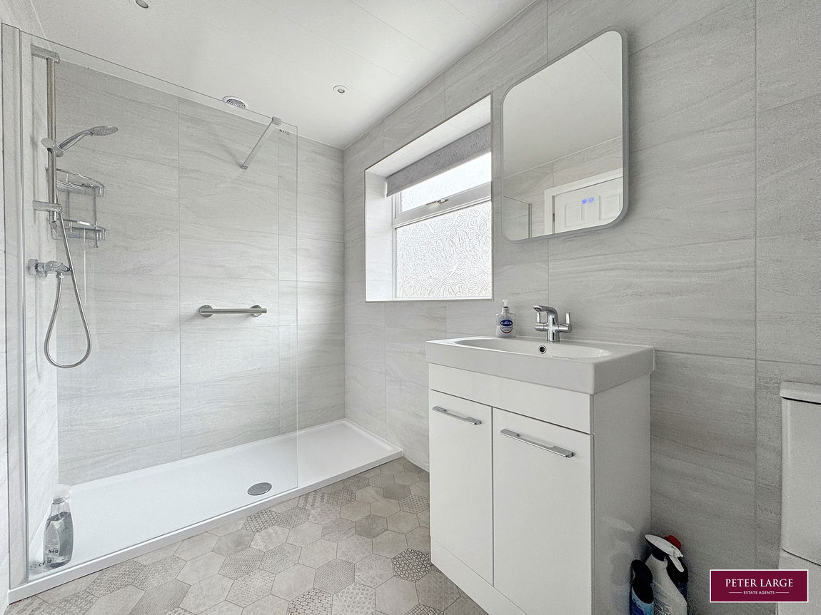 Having a modern three piece suite comprising large walk-in shower with glass screen, wash hand basin set into vanity unit, low flush w.c., chrome heated towel rail, fully tiled walls, inset spotlighting and a obscure glazed window.