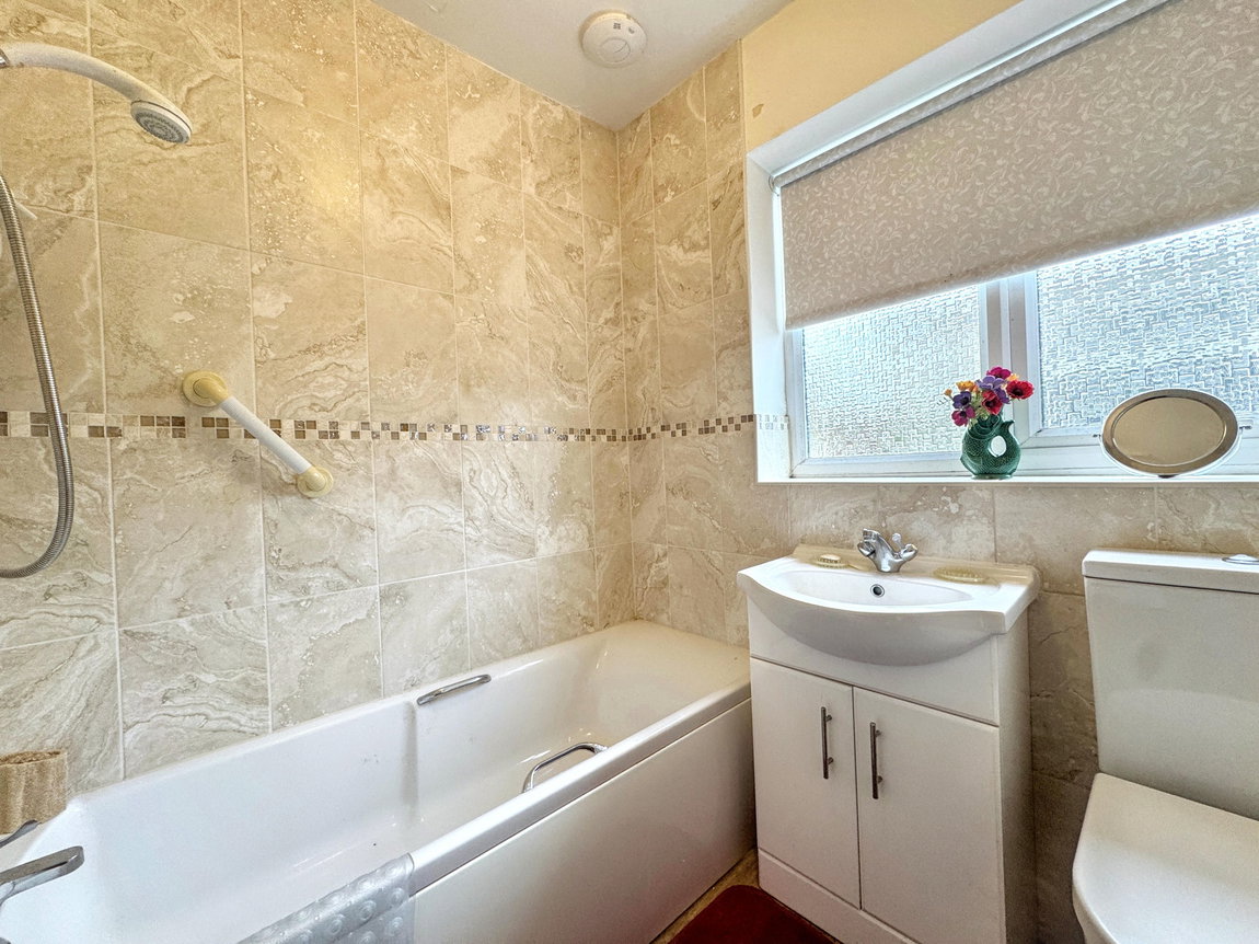Fitted with a three piece suite comprising low flush wc, pedestal wash hand basin and bath basin with electric shower. Obscure glazed window, mostly tiled walls and radiator.
