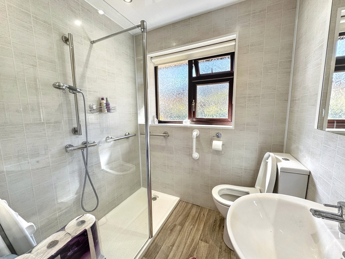 Fitted with a three piece suite comprising wc, pedestal wash hand basin and shower cubicle. Ceiling spotlights, fully tiled walls, obscure glazed window and chrome 'ladder style' radiator.