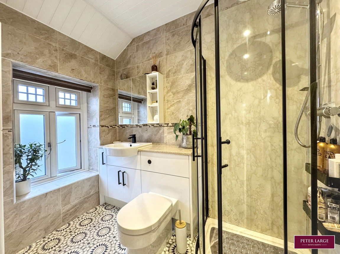 Having a three piece suite comprising shower cubicle with rainfall shower head and additional shower attachment, wash hand basin and w.c set into vanity unit, heated towel rail, fully tiled walls and a obscure glazed window.