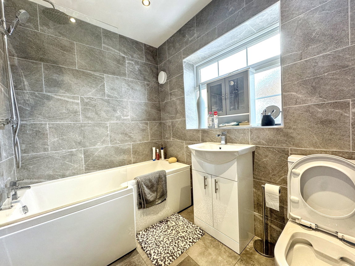 Fitted with a three piece suite comprising low flush wc, basin fitted over cabinet and a 'P' shaped bath with shower and screen. Ceiling spotlights, obscure glazed window, fully tiled walls.